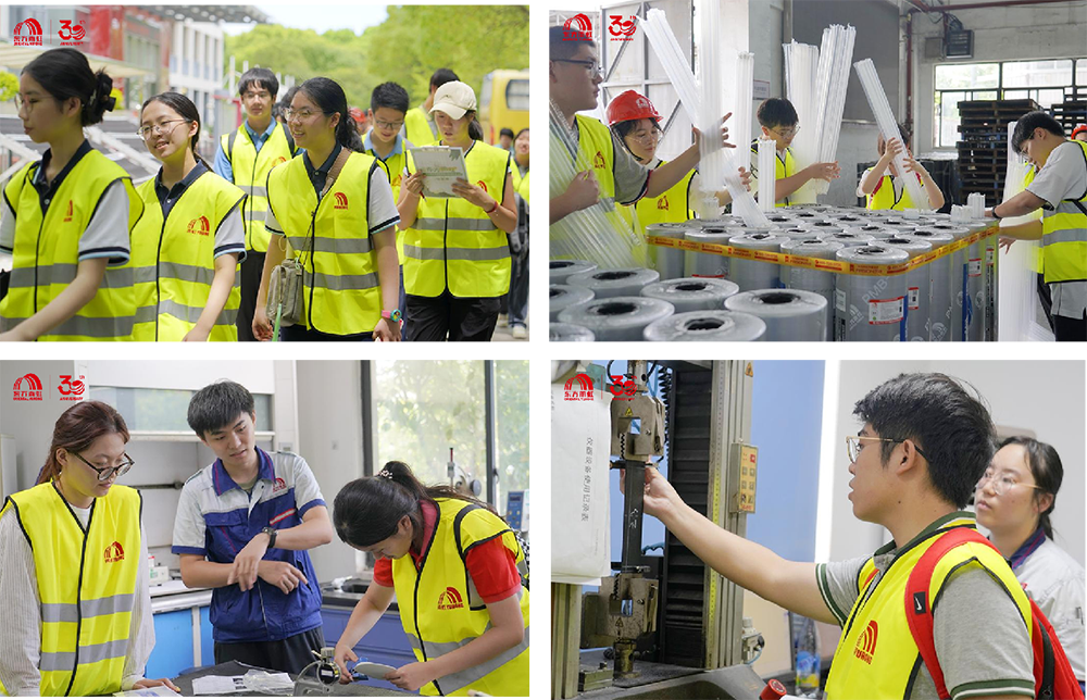 在東方雨虹上海生產研發物流基地展廳內,安環資深經理陳濤詳細介紹企業發展歷程、參建經典工程案例及核心產品。直觀展示配合生動講解,幫助學生建立對東方雨虹產品特點與技術優勢的初步認知,為后續實踐奠定基礎。